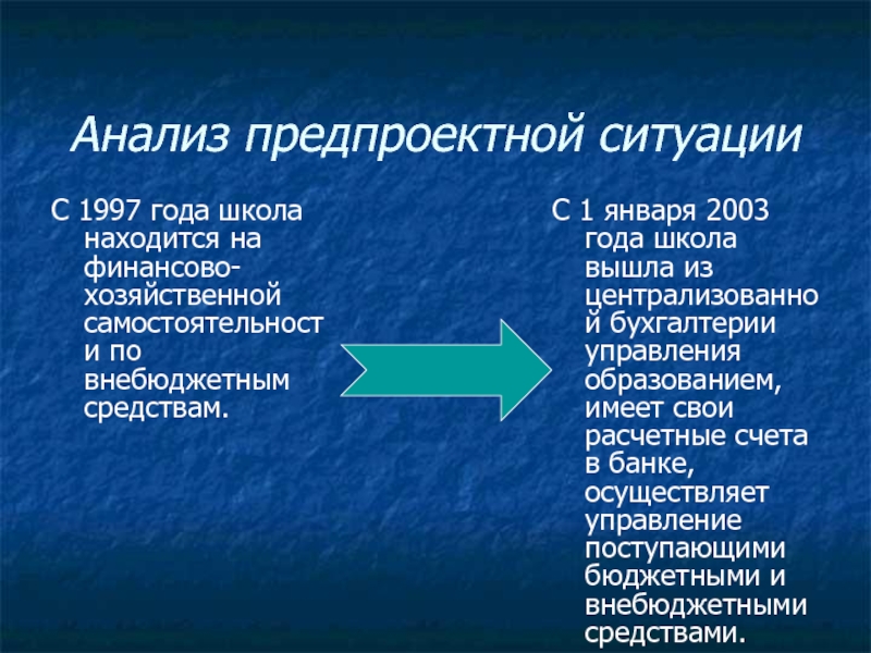 С 1 января 2003 года школа вышла из централизованной бухгалтерии управления образованием, имеет свои расчетные счета в банке, осуществляет управление поступающими бюджетными и внебюджетными средствами.