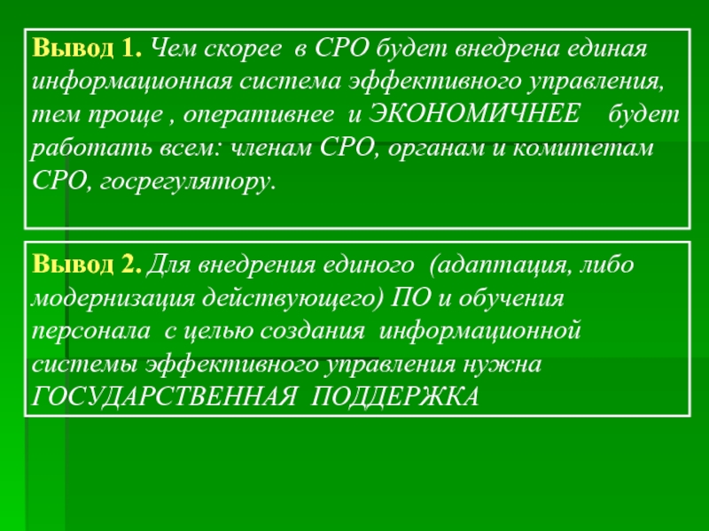 Вывод 2. Для внедрения единого (адаптация, либо модернизация действующего) ПО и обучения персонала с целью создания информационной системы эффективного управления нужна ГОСУДАРСТВЕННАЯ ПОДДЕРЖКА