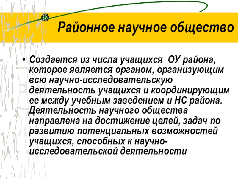 района, которое является органом, организующим всю научно-исследовательскую деятельность учащихся и координирующим ее между учебным заведением и НС района. Деятельность научного общества направлена на достижение целей, задач по развитию потенциальных возможностей учащихся, способных к научно-исследовательской деятельности