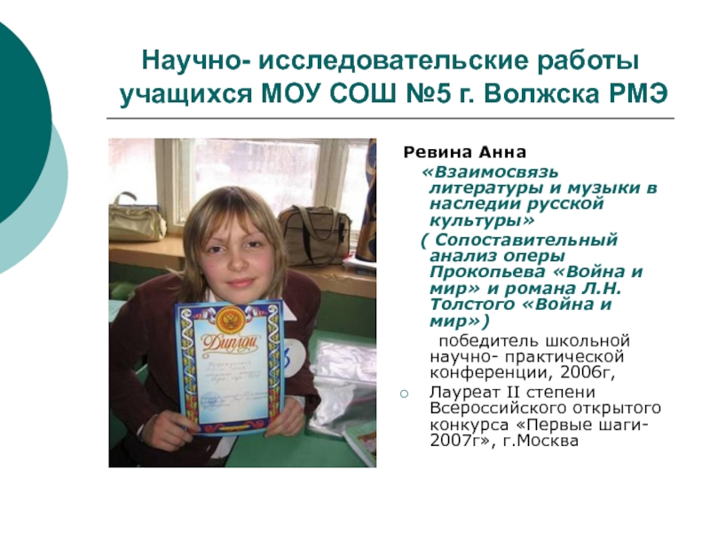Слайд 19 Научно- исследовательские работы учащихся МОУ СОШ №5 г. Волжска РМЭ