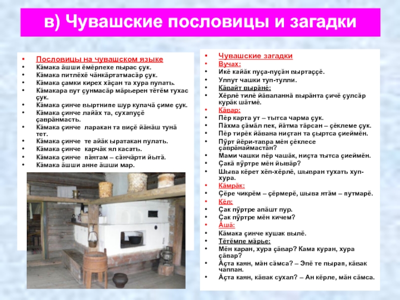 Ӑҫта каян, мӑн сӑмса? – Эпӗ те пырап, кӑвак чаппан.