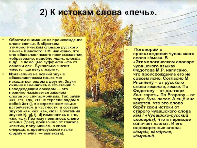Поговорим о происхождении чувашского слова кӑмака. В «Этимологическом словаре чувашского языка» Федотова М.Р. написано, что происхождение его не совсем ясно. Согласно М.Рясянену – от русского слова каменка, камка. По Федотову – от др.-тюрк. Кен- гореть. По Егорову – от тюрк. Кум- песок. А ещё мне кажется, что это слово берёт свои истоки от старого чувашского слова кӑм ( «Чувашско-русский словарь»), что в переводе означает «зола». И его однокоренные слова: кӑмрӑк, кӑмӑрчак, кӑмраннӑ.