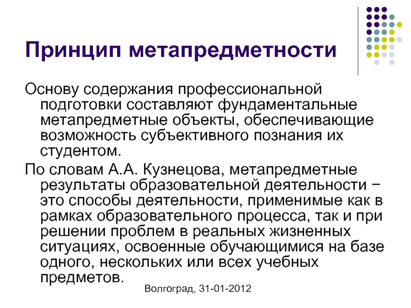 По словам А.А. Кузнецова, метапредметные результаты образовательной деятельности − это способы деятельности, применимые как в рамках образовательного процесса, так и при решении проблем в реальных жизненных ситуациях, освоенные обучающимися на базе одного, нескольких или всех учебных предметов.