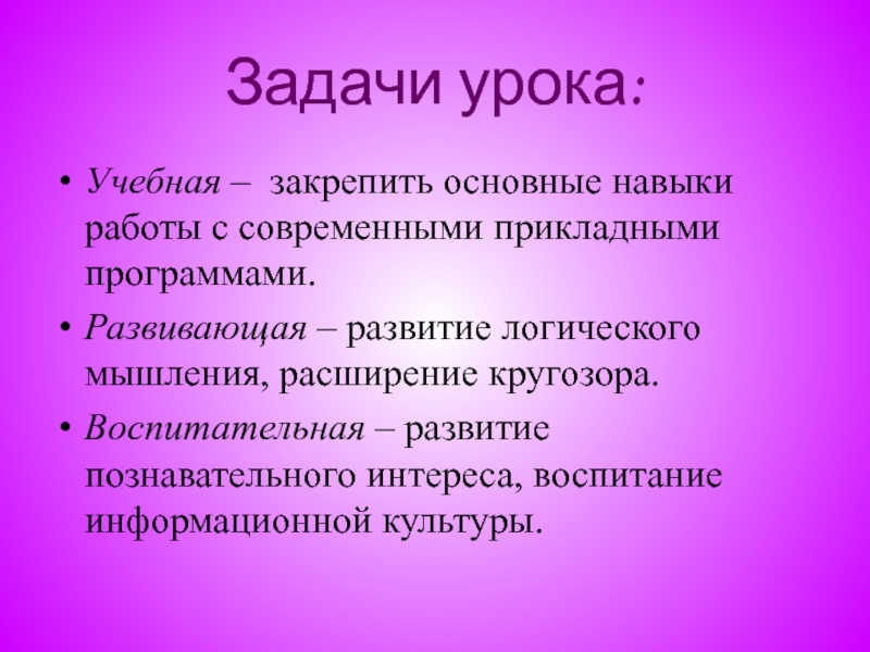 Учебная – закрепить основные навыки работы с современными прикладными программами.