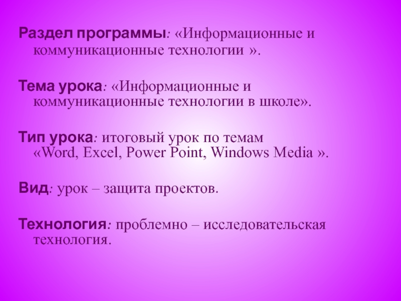 Тип урока: итоговый урок по темам «Word, Excel, Power Point, Windows Media ».