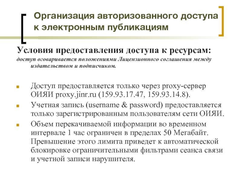 Слайд 13Организация авторизованного доступа к электронным публикациям