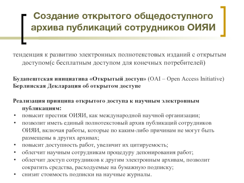 Слайд 20Создание открытого общедоступного архива публикаций сотрудников ОИЯИ
