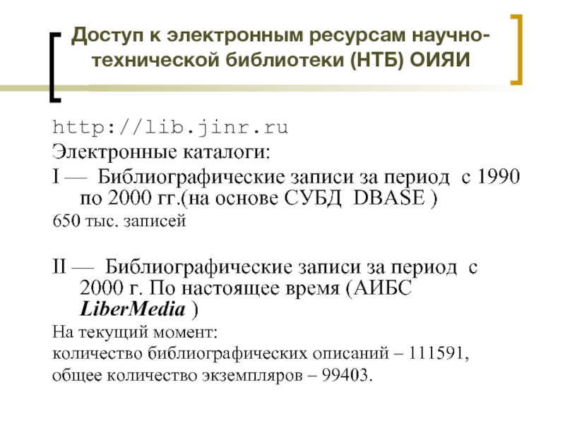 Слайд 10Доступ к электронным ресурсам научно-технической библиотеки (НТБ) ОИЯИ.