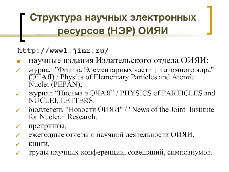 Слайд 3Структура научных электронных ресурсов (НЭР) ОИЯИ