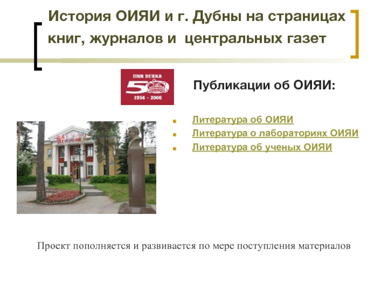 Слайд 15История ОИЯИ и г. Дубны на страницах книг, журналов и  центральных
