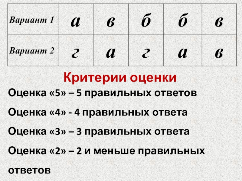 ная Вариант 1 авббв Вариант 2 гагав Критерии оценки Оценка 5 – 5 правильных ответов Оценка 4 - 4 правильных ответа Оценка 3 – 3 правильных ответа. презентация