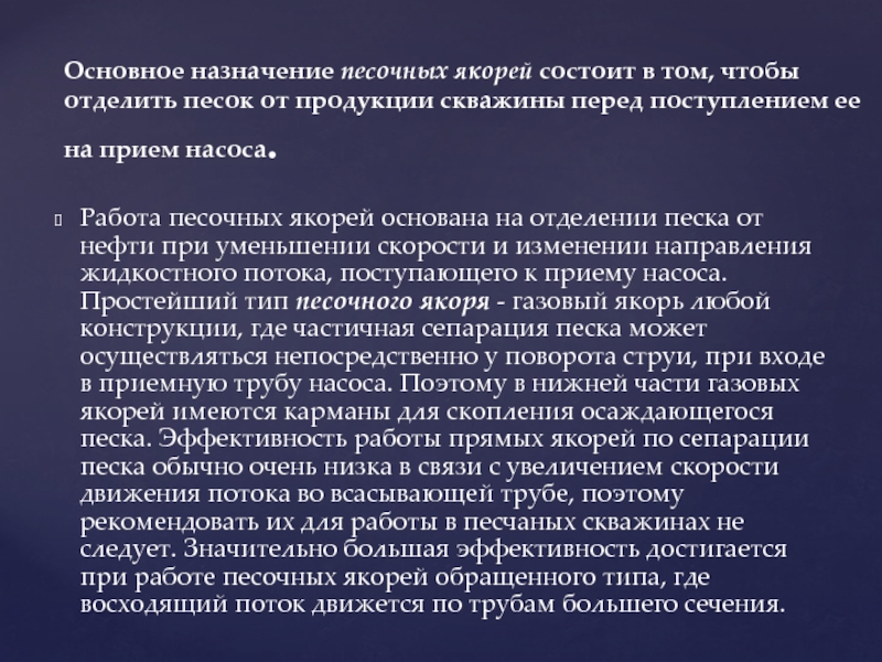 Основное назначение песочных якорей состоит в том, чтобы отделить песок от продукции скважины перед поступлением ее на прием насоса.