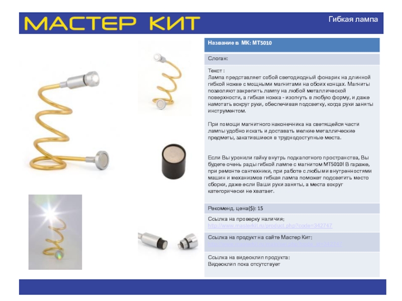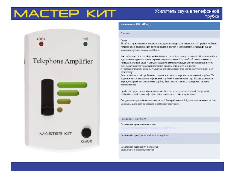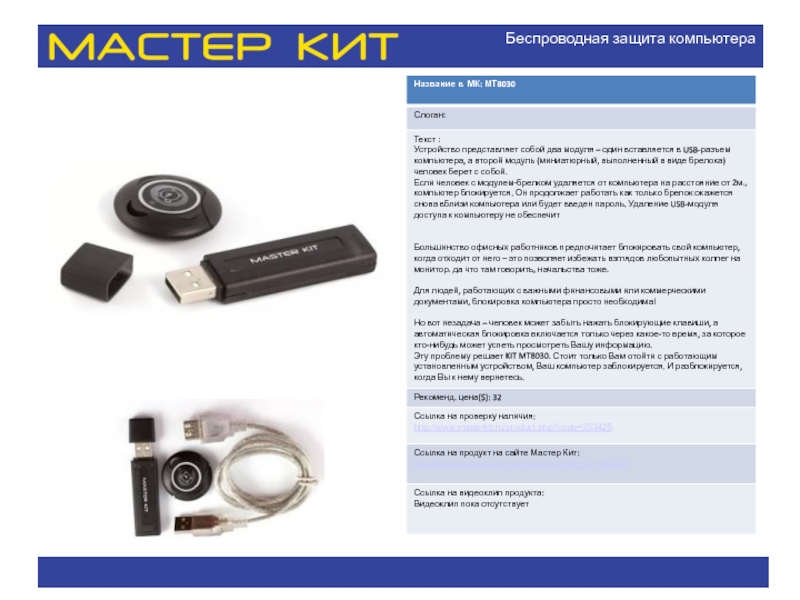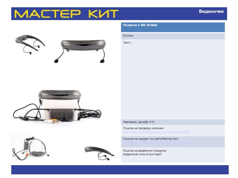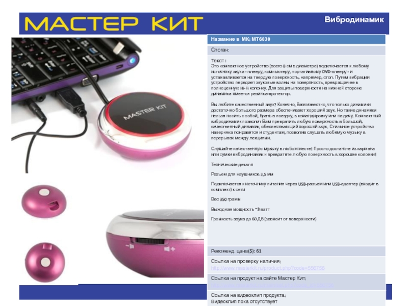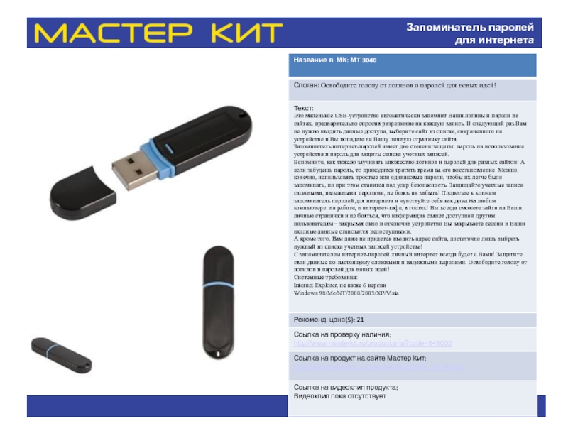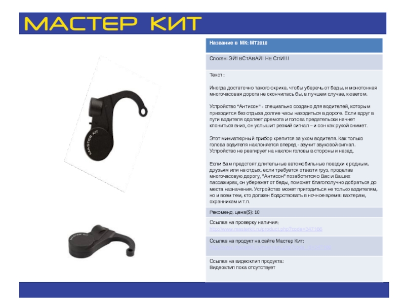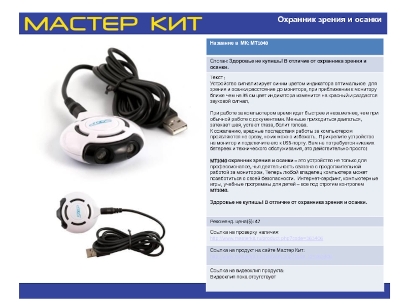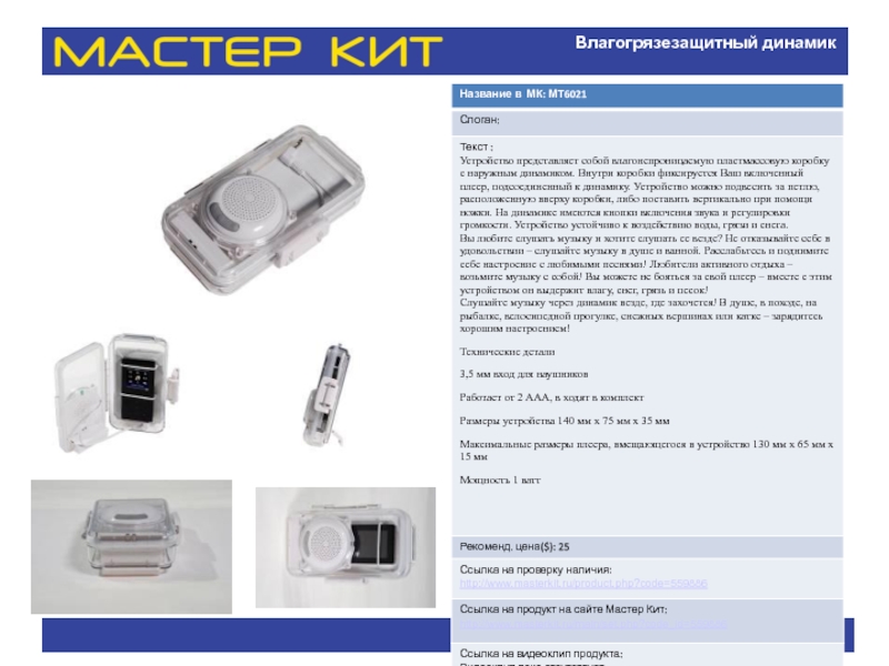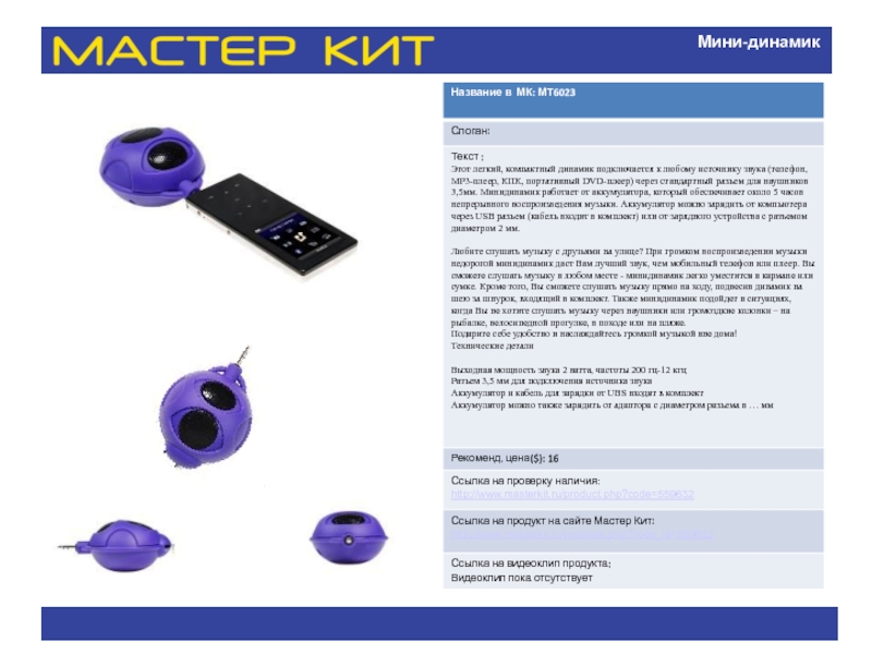 Название в МК: МТ6050 Слоган: Текст : Элегантный, необычный унисекс-аксессуар с функцией МР3-плеера на солнечной батарее. Легкое, компактное, функциональное. презентация