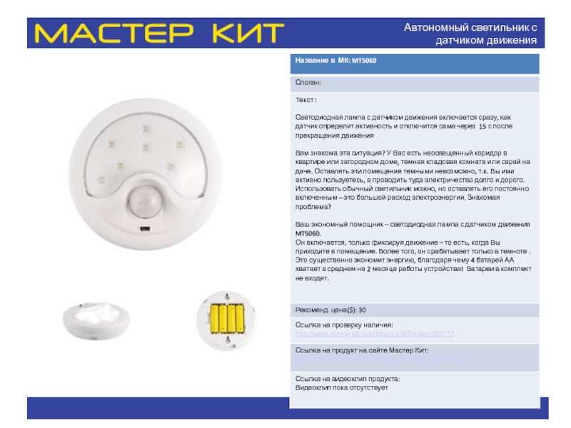 Слайд 6Автономный светильник с датчиком движения