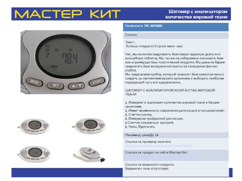 Слайд 10Шагомер с анализатором количества жировой ткани