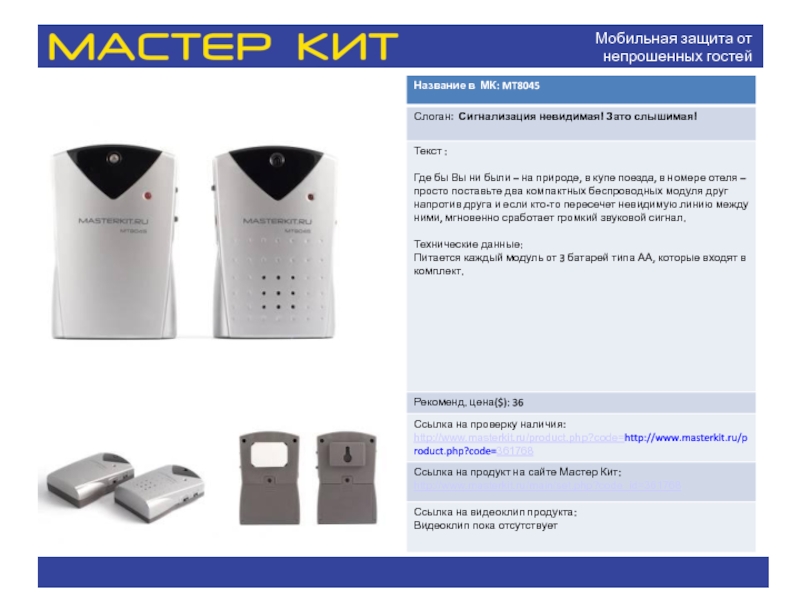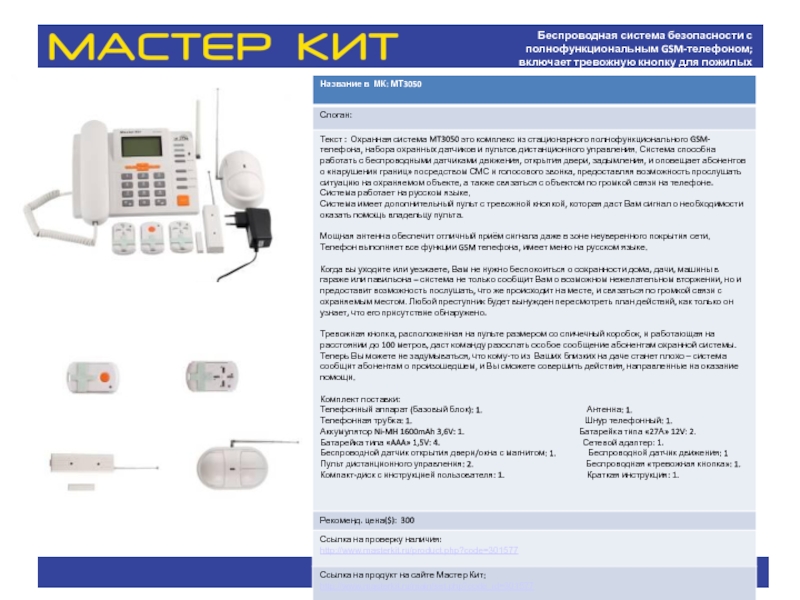 Слайд 18Беспроводная система безопасности с полнофункциональным GSM-телефоном; включает тревожную кнопку для пожилых