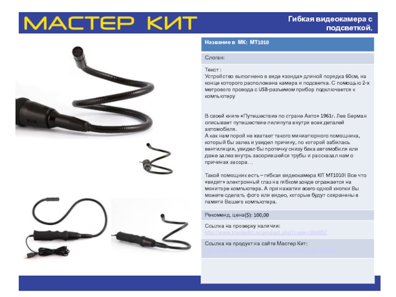 Слайд 14Гибкая видеокамера с подсветкой.