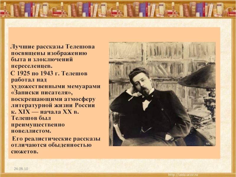 С 1925 по 1943 г. Телешов работал над художественными мемуарами «Записки писателя», воскрешающими атмосферу литературной жизни России к. XIX — начала ХХ в.