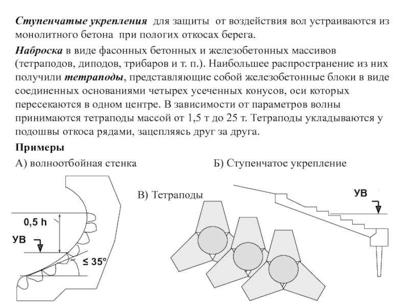Слайд 20Ступенчатые укрепления для защиты от воздействия вол устраиваются из монолитного бетона