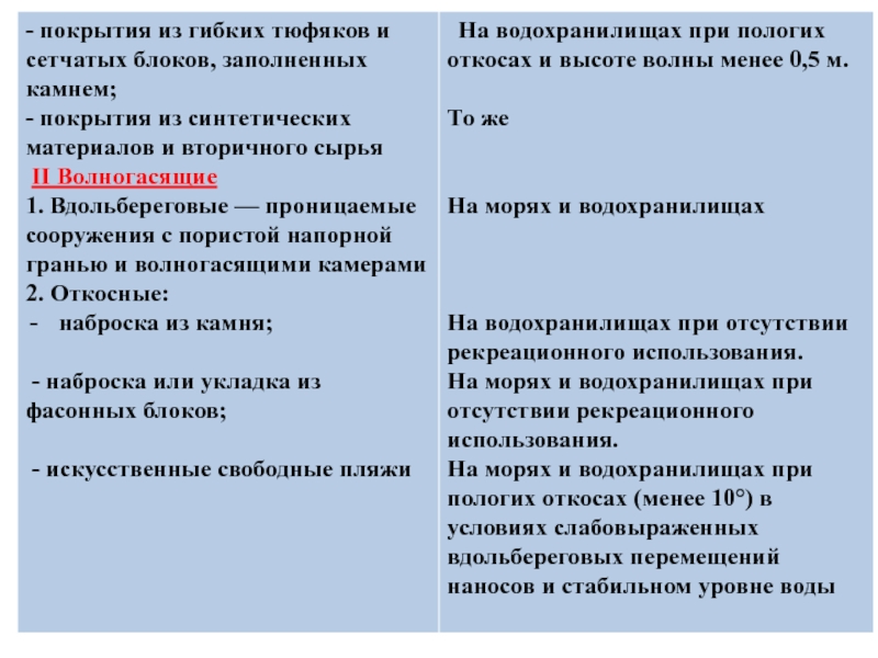 волногасящие: откосные покрытия в виде набросок из камня или фасонных блоков, искусственные свободные пляжи;