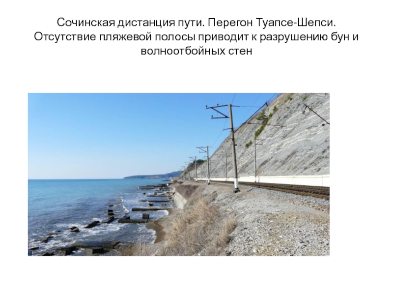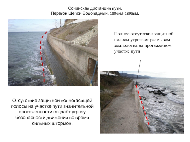 Отсутствие защитной волногасящей полосы на участке пути значительной протяженности создаёт угрозу безопасности движения во время сильных штормов.