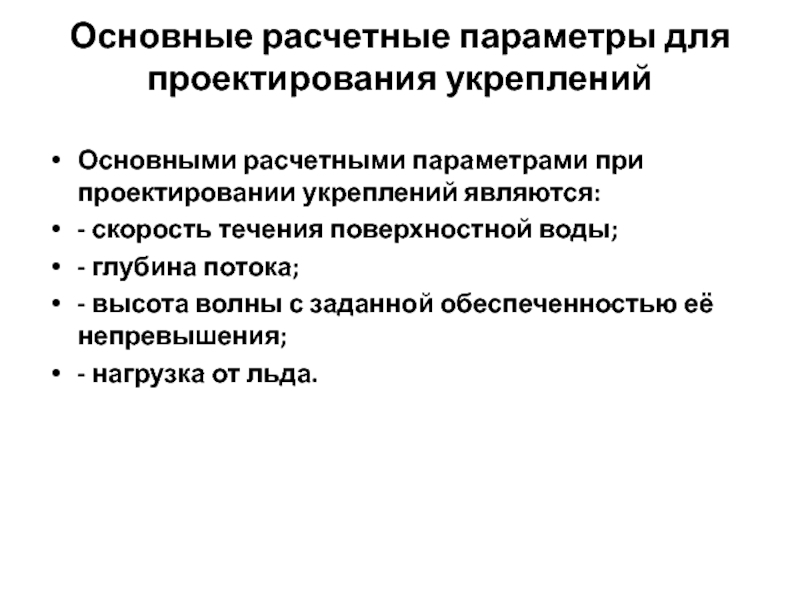 Слайд 6Основные расчетные параметры для проектирования укреплений