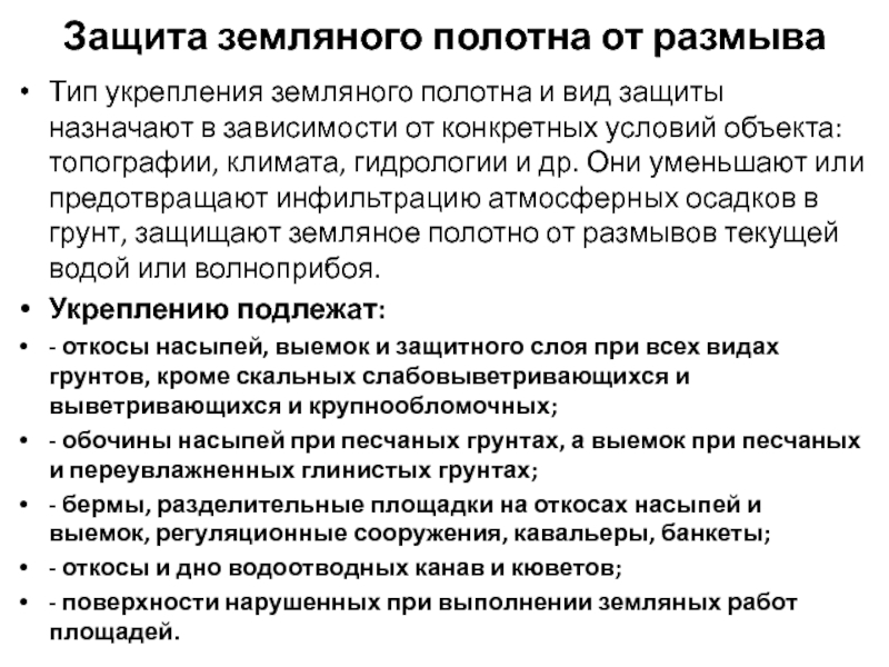 назначают в зависимости от конкретных условий объекта: топографии, климата, гидрологии и др. Они уменьшают или предотвращают инфильтрацию атмосферных осадков в грунт, защищают земляное полотно от размывов текущей водой или волноприбоя.