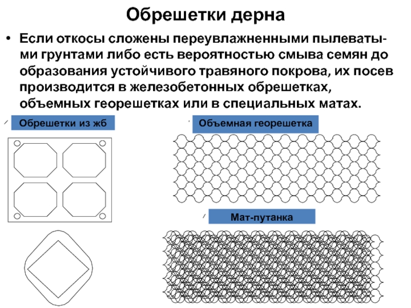 семян до образования устойчивого травяного покрова, их посев производится в железобетонных обрешетках, объемных георешетках или в специальных матах.