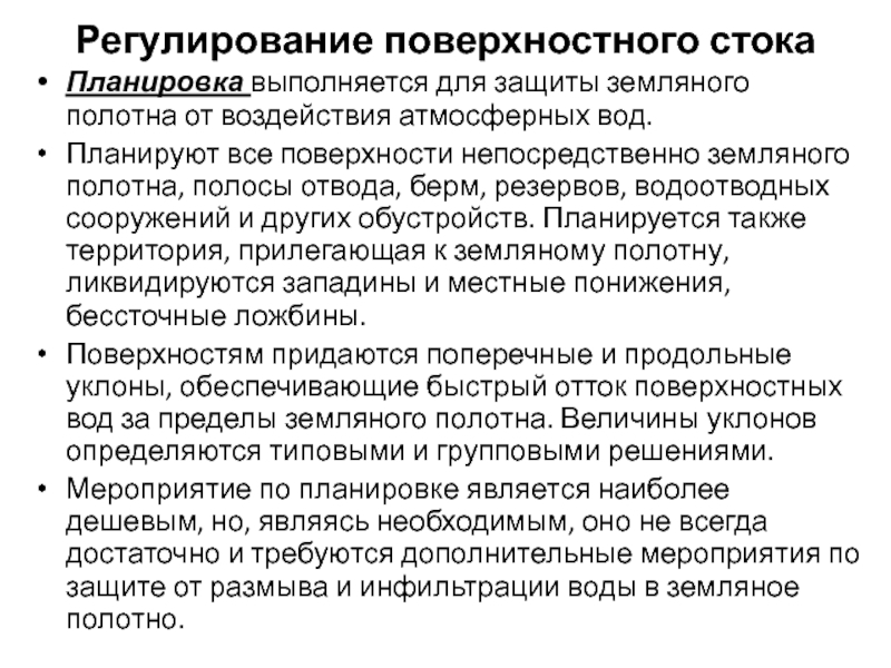 Мероприятие по планировке является наиболее дешевым, но, являясь необходимым, оно не всегда достаточно и требуются дополнительные мероприятия по защите от размыва и инфильтрации воды в земляное полотно.
