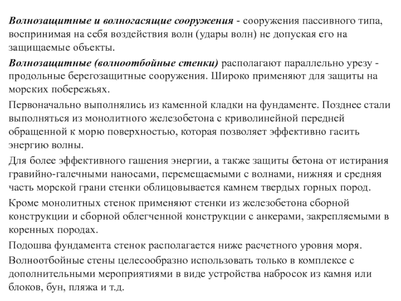 Слайд 19Волнозащитные и волногасящие сооружения - сооружения пассивного типа, воспринимая на себя