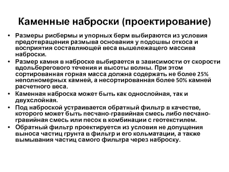 Размер камня в наброске выбирается в зависимости от скорости вдольберегового течения и высоты волны. При этом сортированная горная масса должна содержать не более 25% неполномерных камней, а несортированная более 50% камней расчетного веса.