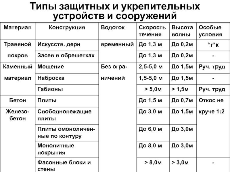 Слайд 7Типы защитных и укрепительных устройств и сооружений