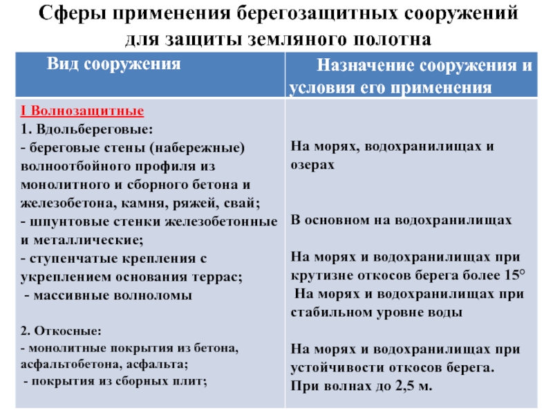 Слайд 16Сферы применения берегозащитных сооружений для защиты земляного полотна