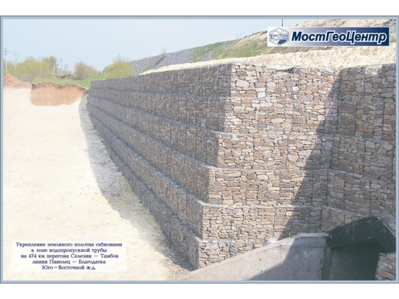 Разрывная нагрузка звеньев сетки 35-53 кН/м. При устройстве габионов в особо коррозионной среде проволока порывается оболочкой из ПВХ.