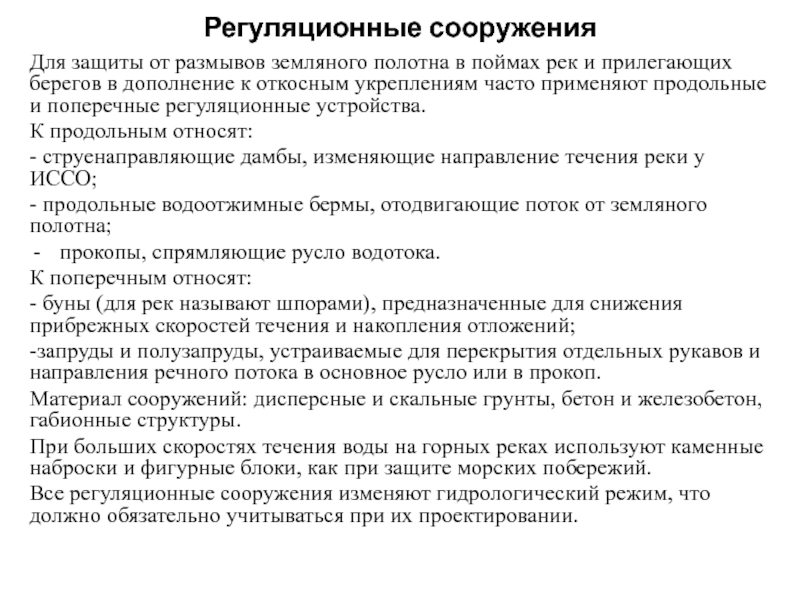 Все регуляционные сооружения изменяют гидрологический режим, что должно обязательно учитываться при их проектировании.
