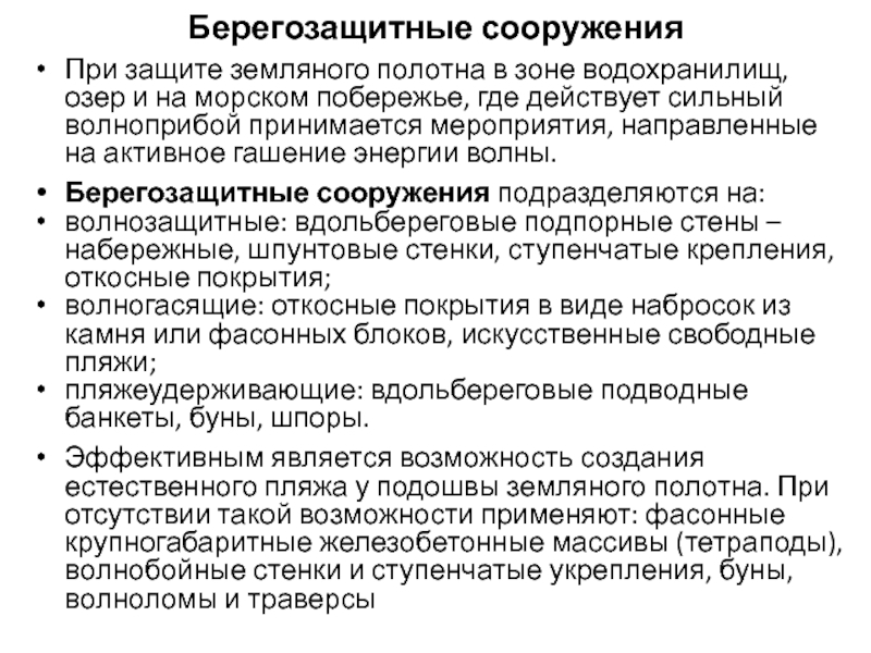 Эффективным является возможность создания естественного пляжа у подошвы земляного полотна. При отсутствии такой возможности применяют: фасонные крупногабаритные железобетонные массивы (тетраподы), волнобойные стенки и ступенчатые укрепления, буны, волноломы и траверсы
