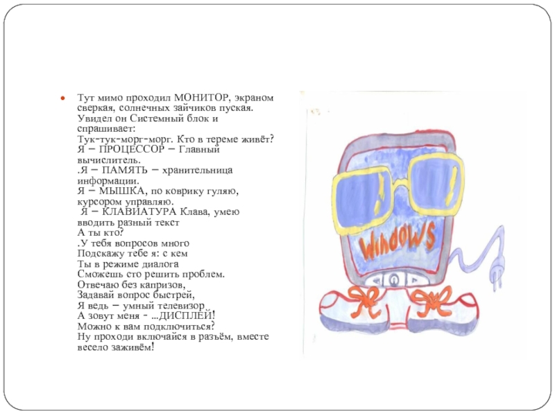 Тут мимо проходил МОНИТОР, экраном сверкая, солнечных зайчиков пуская. Увидел он