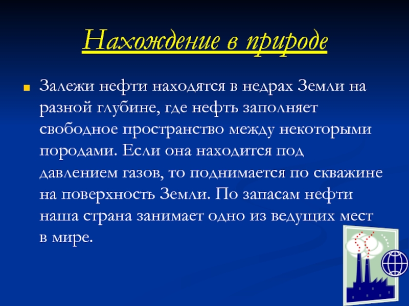 где нефть заполняет свободное пространство между некоторыми породами. Если она находится под давлением газов, то поднимается по скважине на поверхность Земли. По запасам нефти наша страна занимает одно из ведущих мест в мире.