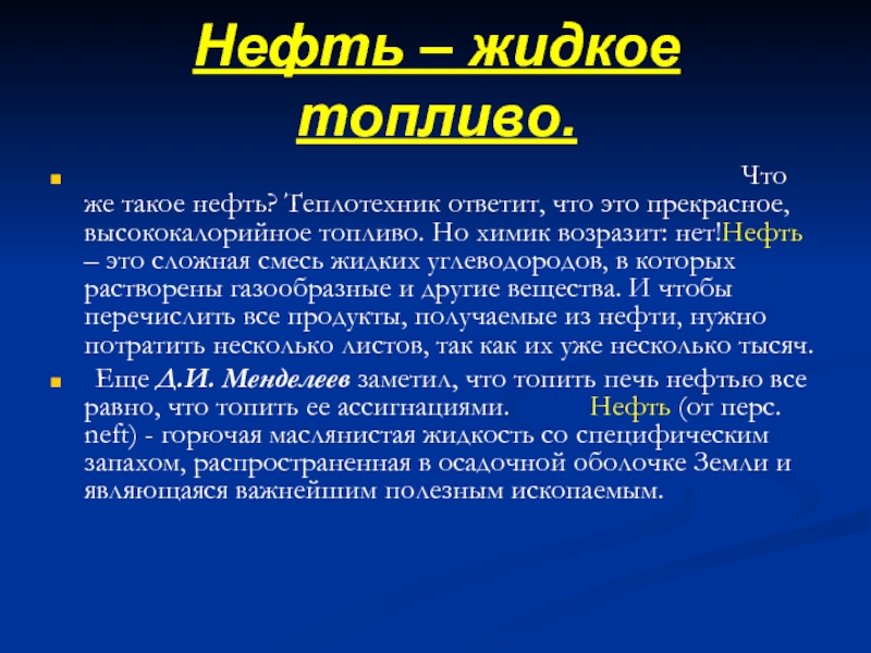 Еще Д.И. Менделеев заметил, что топить печь нефтью все равно, что топить ее ассигнациями. Нефть (от перс. neft) - горючая маслянистая жидкость со специфическим запахом, распространенная в осадочной оболочке Земли и являющаяся важнейшим полезным ископаемым.