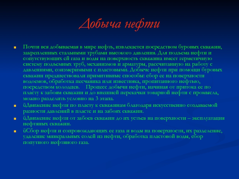 закрепленных стальными трубами высокого давления. Для подъема нефти и сопутствующих ей газа и воды на поверхность скважина имеет герметичную систему подъемных труб, механизмов и арматуры, рассчитанную на работу с давлениями, соизмеримыми с пластовыми. Добыче нефти при помощи буровых скважин предшествовали примитивные способы: сбор ее на поверхности водоемов, обработка песчаника или известняка, пропитанного нефтью, посредством колодцев. Процесс добычи нефти, начиная от притока ее по пласту к забоям скважин и до внешней перекачки товарной нефти с промысла, можно разделить условно на 3 этапа.