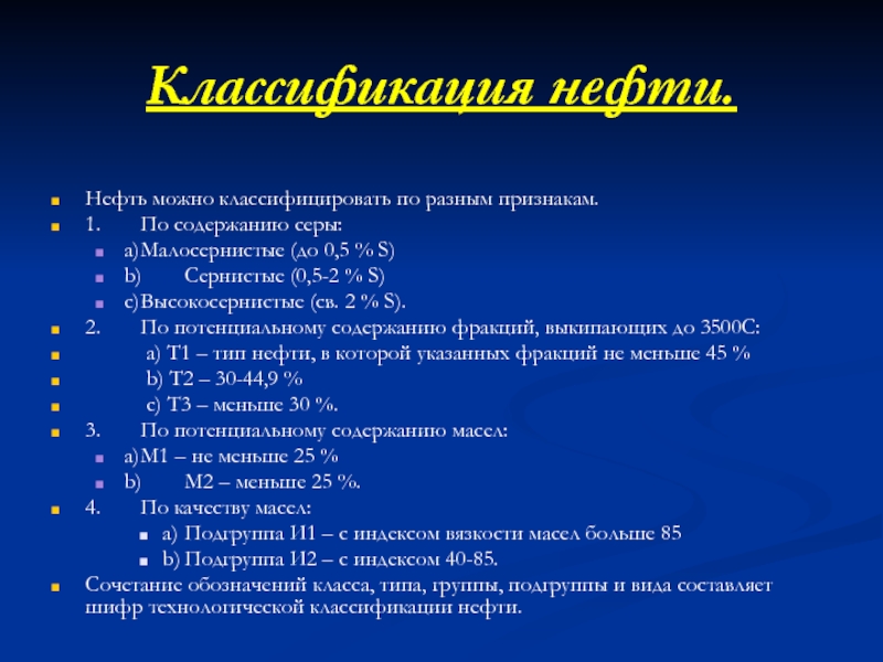 Сочетание обозначений класса, типа, группы, подгруппы и вида составляет шифр технологической классификации нефти.