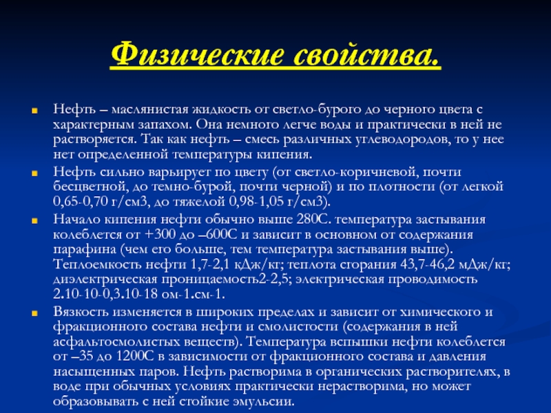 Вязкость изменяется в широких пределах и зависит от химического и фракционного состава нефти и смолистости (содержания в ней асфальтосмолистых веществ). Температура вспышки нефти колеблется от –35 до 1200С в зависимости от фракционного состава и давления насыщенных паров. Нефть растворима в органических растворителях, в воде при обычных условиях практически нерастворима, но может образовывать с ней стойкие эмульсии.