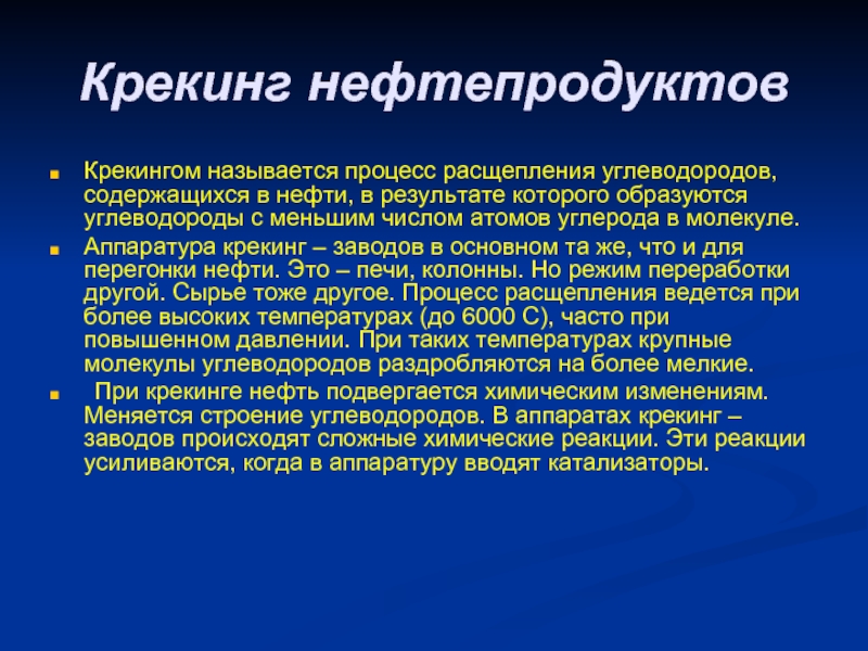 Крекингом называется процесс расщепления углеводородов, содержащихся в нефти, в результате
