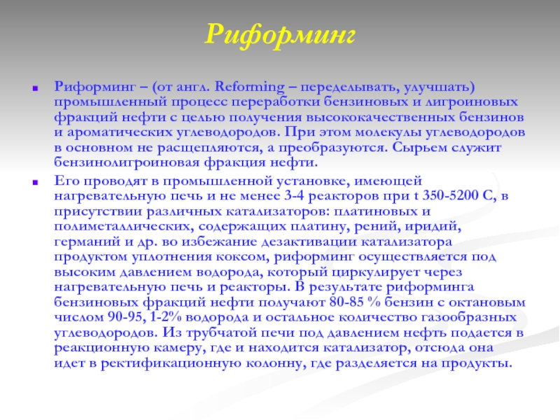 Риформинг – (от англ. Reforming – переделывать, улучшать) промышленный процесс переработки