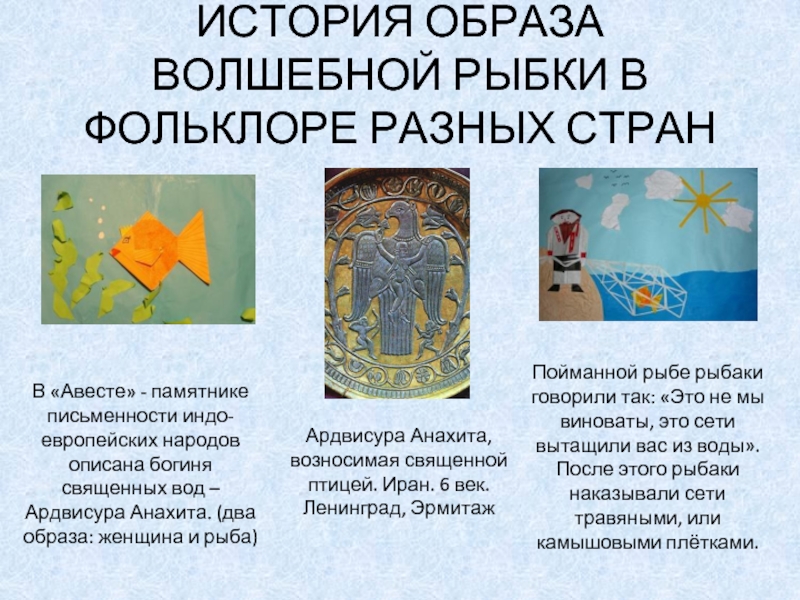 В «Авесте» - памятнике письменности индо-европейских народов описана богиня священных вод – Ардвисура Анахита. (два образа: женщина и рыба)
