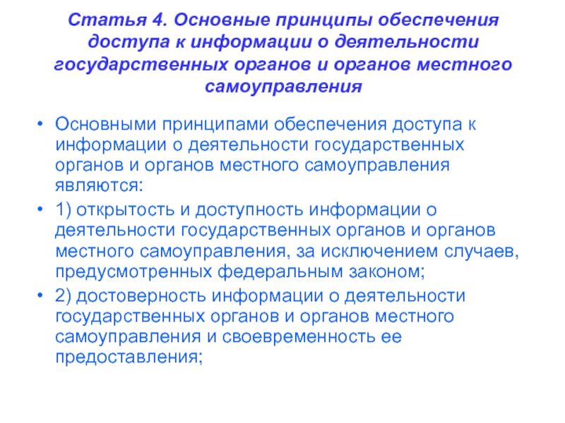 1) открытость и доступность информации о деятельности государственных органов и органов местного самоуправления, за исключением случаев, предусмотренных федеральным законом;