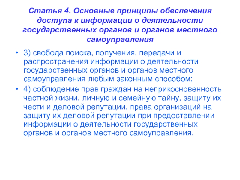 4) соблюдение прав граждан на неприкосновенность частной жизни, личную и семейную тайну, защиту их чести и деловой репутации, права организаций на защиту их деловой репутации при предоставлении информации о деятельности государственных органов и органов местного самоуправления.