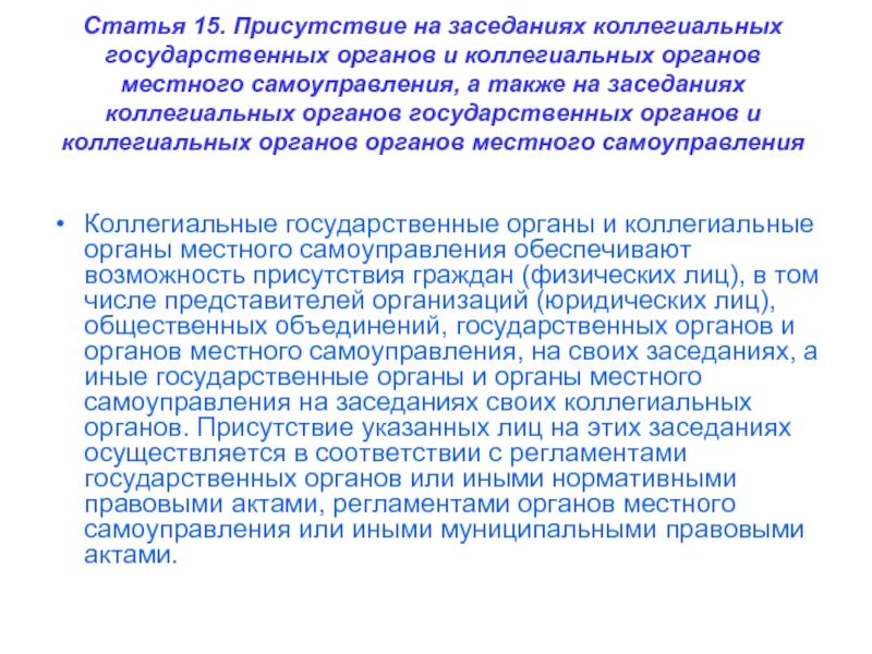 Коллегиальные государственные органы и коллегиальные органы местного самоуправления обеспечивают возможность присутствия граждан (физических лиц), в том числе представителей организаций (юридических лиц), общественных объединений, государственных органов и органов местного самоуправления, на своих заседаниях, а иные государственные органы и органы местного самоуправления на заседаниях своих коллегиальных органов. Присутствие указанных лиц на этих заседаниях осуществляется в соответствии с регламентами государственных органов или иными нормативными правовыми актами, регламентами органов местного самоуправления или иными муниципальными правовыми актами.