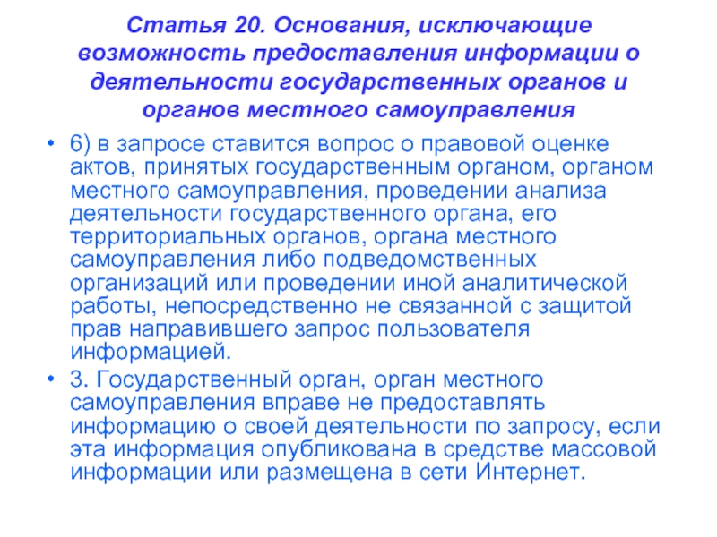 6) в запросе ставится вопрос о правовой оценке актов, принятых государственным органом, органом местного самоуправления, проведении анализа деятельности государственного органа, его территориальных органов, органа местного самоуправления либо подведомственных организаций или проведении иной аналитической работы, непосредственно не связанной с защитой прав направившего запрос пользователя информацией.