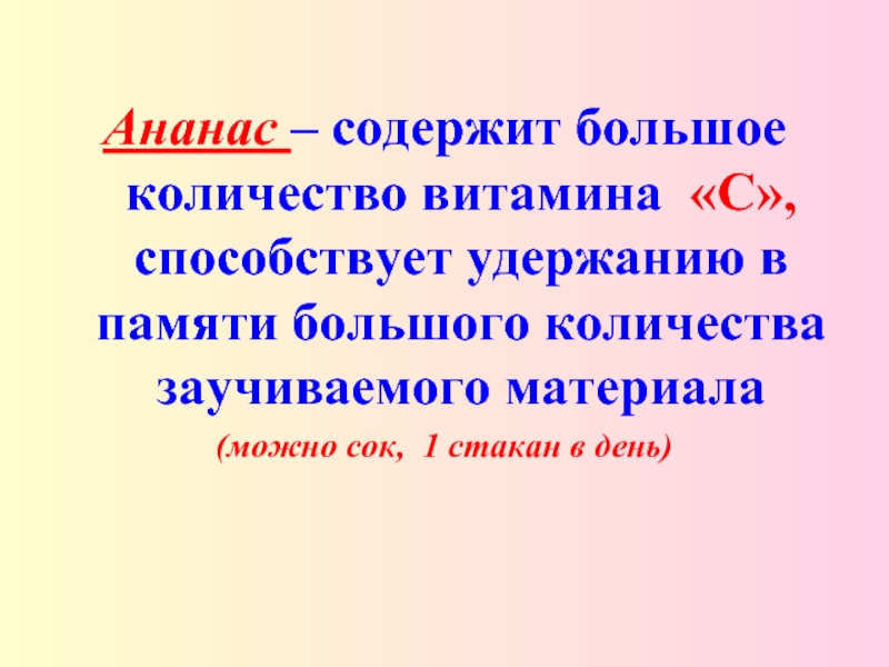 Слайд 6Ананас – содержит большое количество витамина «С», способствует удержанию в памяти